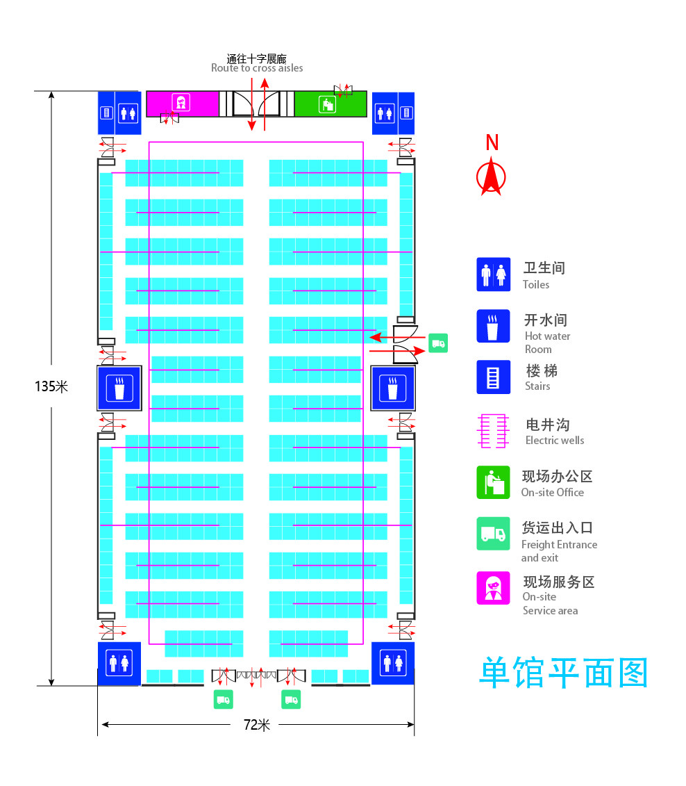 青島世博城國(guó)際展覽中心總建筑面積20萬(wàn)平方米,可容納6156個(gè)國(guó)際標(biāo)準(zhǔn)展位。場(chǎng)館由12個(gè)矩形展館組成,單館凈面積1萬(wàn)平方米,凈高12.5米,地面承重3—5噸,單館供電量3千KW。展館中央用十字展廊分隔,展廊東西長(zhǎng)550米,凈寬45米,南北長(zhǎng)350米,凈寬35米,展廊凈面積4萬(wàn)平方米。環(huán)館物流通道寬23米,所有貨運(yùn)門高、寬均超過(guò)7米,滿足各類超寬、超大型貨車直接進(jìn)館卸貨。整個(gè)展覽中心設(shè)計(jì),采用當(dāng)?shù)貧v史遺跡“瑯琊臺(tái)”為造型意向,并引入柔美海洋文化元素,體現(xiàn)中國(guó)傳統(tǒng)文化與海洋文化的有機(jī)統(tǒng)一。